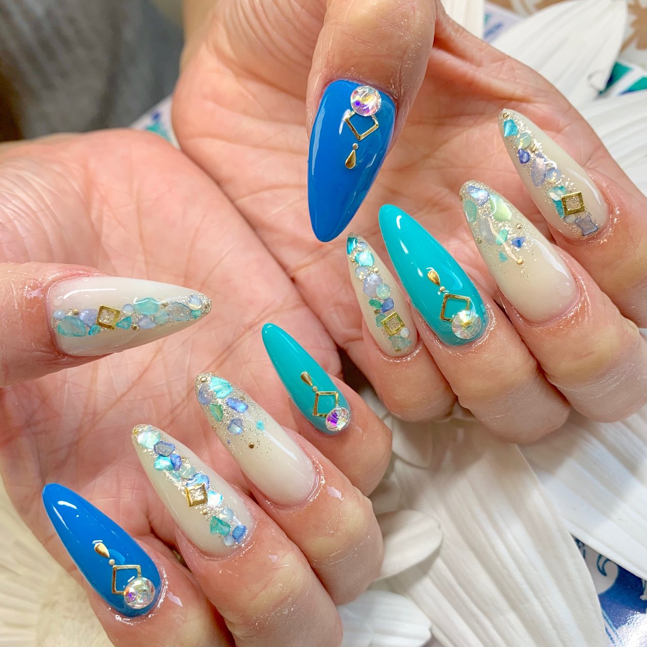 Progress Mai On Instagram 外でも輝いて 可愛かった スカルプ スカルプネイル ロングスカルプ ロングネイル シェルネイル シェル 青ネイル ブルーネイル ラメ ラメネイル 春ネイル Japanese Nail Art Nail Designs Japanese Nails